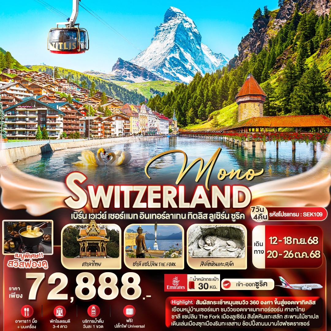 ♥ SEK109 MONO SWITZERLAND เบิร์น เวเว่ย์ เซอร์แมท อินเทอร์ลาเกน ทิตลิส ลูเซิร์น ซูริค 7 วัน 4 คืน✈️ สายการบิน ???????????????????????????????? (????????)???? น้ำหนักสัมภาระ 30 Kg. / Carry On 7 Kg.⭐️ บริการน้ำดื่มวันละ 1 ขวด ???? แจกฟรี !! ปลั๊กไฟยูนิเวอร์แซล
