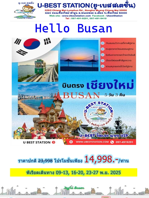 ปูซาน เกาหลีใต้บินตรงเชียงใหม่ 5 วัน3คืน พีเรียดบิน พย. เพียง 14,998.-