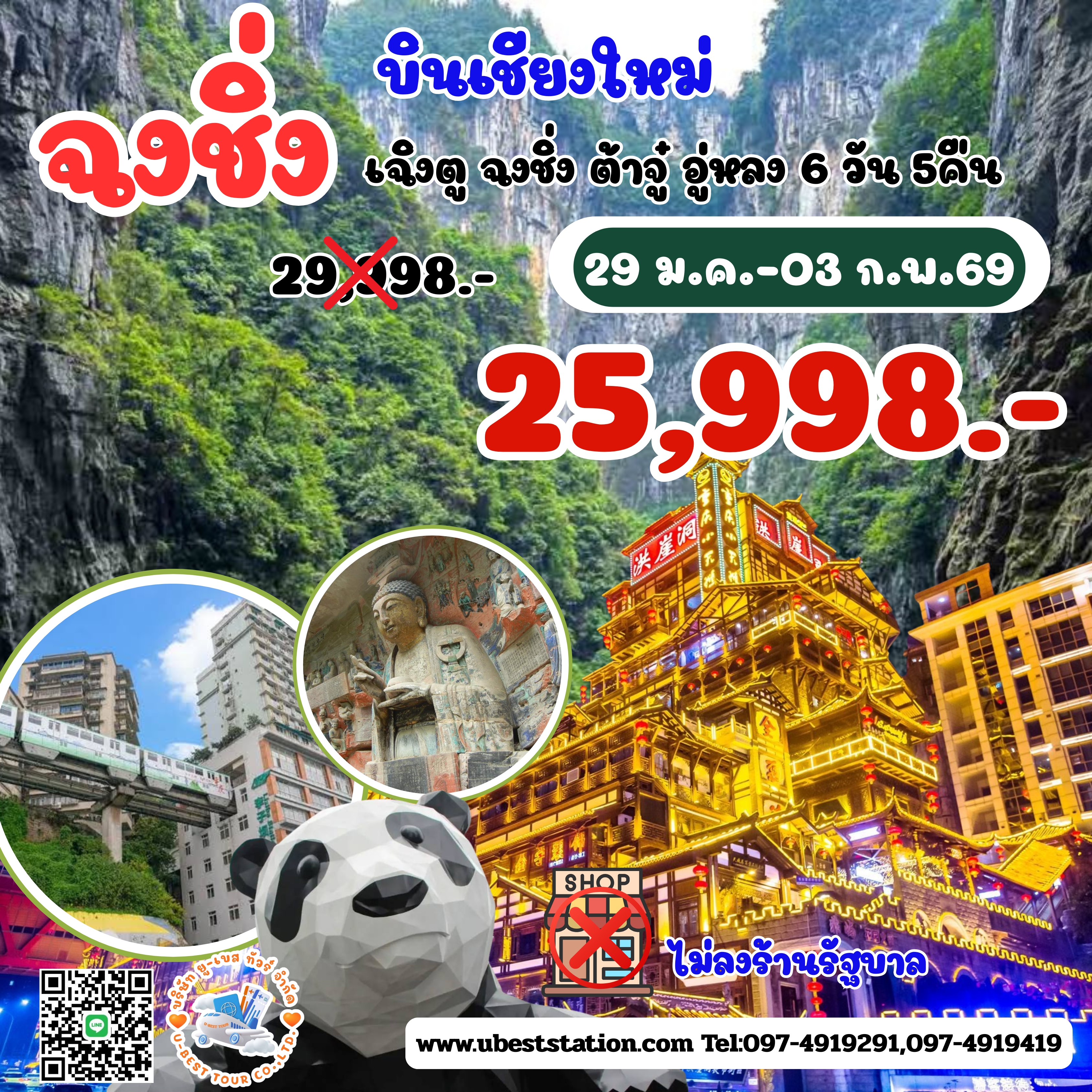 เชียงใหม่ เฉิงตู ฉงชิ่ง ต้าจู๋ อู่หลง 6วัน5คืน 29มค-03กพเพียง 25,998.-