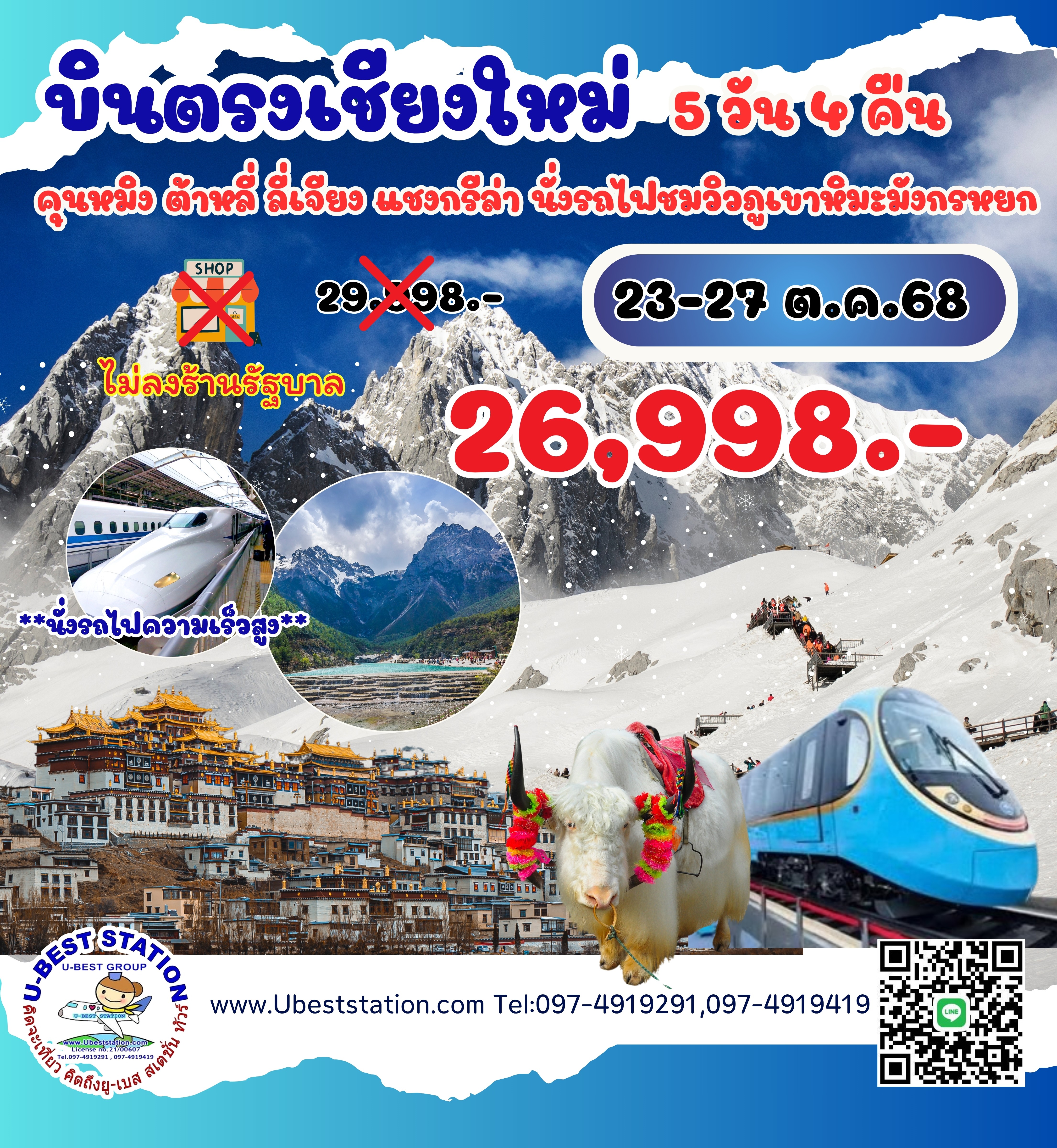♥️ต้าหลี่♥️วัดเจ้าแม่กวนอิม♥️เมืองโบราณต้าหลี่♥️เมืองโบราณแชงกรีล่า♥️วัดลามะซงจ้านหลิง ♥️ช่องแคบเสือกระโจน(รวมบันไดเลื่อน)♥️เมืองโบราณไป๋ซา+ร้านกาแฟหยุนตี้อัน ♥️เมืองโบราณลี่เจียง♥️ภูเขาหิมะมังกรหยก(รวมกระเช้าใหญ่)♥️Impression Lijiang ♥️หุบเขาน้ำเงิน(รวมรถราง)♥️นั่งรถไฟชมวิวภูเขาหิมะมังกรหยก♥️นั่งรถไฟความเร็วสูง ♥️ช้อปปิ้งถนนคนเดินหนานผิง + POP MART